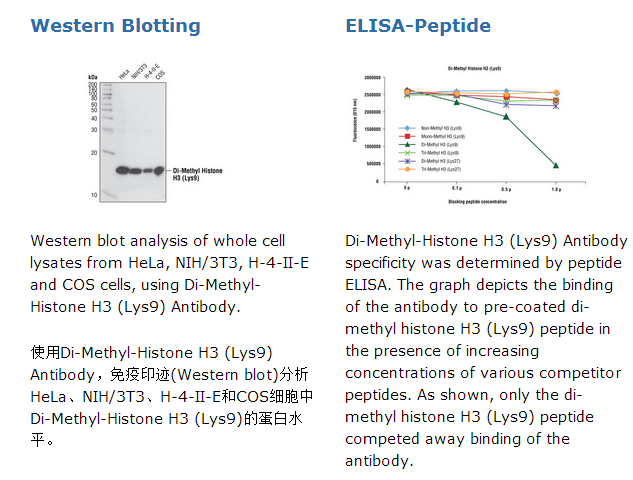 Di-Methyl-Histone H3 (Lys9) Antibody detects endogenous levels of histone H3 only when di-methylated on Lys9. The antibody does not cross-react with non-methylated, mono-methylated, or tri-methylated Lys9. In addition, the antibody does not cross-react with di-methylated or tri-methylated histone H3 Lys27.