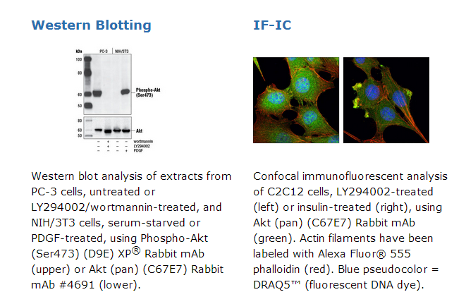 Each phospho-specific antibody recognizes the phosphorylated form of its target. Akt Antibody recognizes total Akt protein, independent of its phosphorylation state.