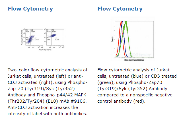 Phospho-Syk (Ser323) and Phospho-Syk (Tyr525/526) Antibodies detect transfected, Tyr323 and Tyr 525/526 phosphorylated human Syk. Syk Antibody and Phospho-Zap-70 (Tyr319)/Syk (Tyr352) Antibodies detect endogenous levels of total human Syk and Tyr352 phosphorylated Syk, respectively. Each phospho-Syk antibody recognizes only the specific phosphorylated form of Syk. The control Syk Antibody recognizes both nonphosphorylated and phosphorylated forms of Syk. Phospho-Zap-70 (Tyr319)/Syk (Tyr352) Antibody cross-reacts with the phosphorylated form of Zap-70. All other antibodies in the kit do not cross-react with phosphorylated or nonphosphorylated forms of other related family members.