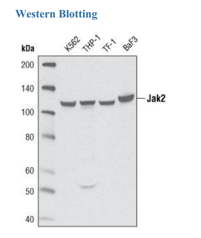 Each isoform-specific antibody is produced by immunizing animals with a synthetic peptide that is specific for the Jak isoform. Jak1 and Jak3 antibodies are purified by protein A and peptide affinity chromatography. Each Jak antibody included in this kit is specific and does not cross-react with the other isoforms.