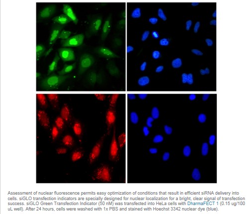 通过转染常规的荧光标记siRNA,然后进行荧光观测评价转染效率与siRNA的RISC结合和基因沉默并不相关。这是由多种因素所决定的,包括siRNA的荧光标签断裂和荧光的迅速悴灭。同时,当用于共转染实验时,有研究表明,如果靶基因siRNA没有经过优化设计,则荧光标记的siRNA将和实验组siRNA竞争性结合RISC(见下图),从而降低实验中siRNA的沉默效果。siGLOTM siRNA是一种全新的、稳定的、荧光标记的对照产品,适合于人和小鼠的对照产品。