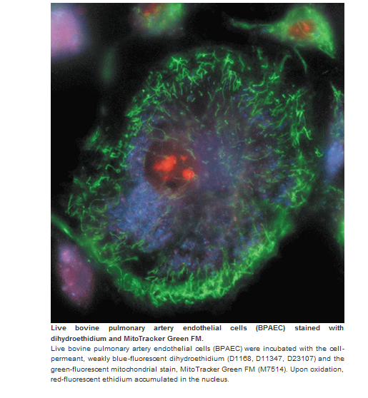 The superoxide indicator dihydroethidium, also called hydroethidine, exhibits blue-fluorescence in the cytosol until oxidized, where it intercalates within the cell's DNA, staining its nucleus a bright fluorescent red. Dihydtroethidium is also available in conveniently packaged 5 mM solution stabilized in DMSO (D23107).