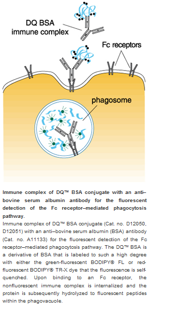 DQ Red BSA is a fluorogenic substrate for proteases. A strong fluorescence quenching effect is observed when proteins are heavily labeled with BODIPY dyes. Upon hydrolysis of the DQ Red BSA to single, dye-labeled peptides by proteases, this quenching is relieved, producing brightly fluorescent products.