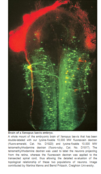 Some applications require that the dextran tracer be treated with formaldehyde or glutaraldehyde for subsequent analysis. For these applications, we offer "lysine-fixable" versions of most of our dextran conjugates of fluorophores or biotin. These dextrans have covalently bound lysine residues that permit dextran tracers to be conjugated to surrounding biomolecules by aldehyde-mediated fixation for subsequent detection by immunohistochemical and ultrastructural techniques. We have also shown that all of our 10,000 MW Alexa Fluor® dextran conjugates can be fixed with aldehyde-based fixatives.