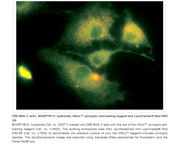 BODIPY® FL hydrazide can be reversibly coupled to aldehydes and ketones to form a Schiff base - which can be reduced to a generate stable amine derivative by sodium borohydride (NaBH4) or sodium cyanoborohydride (NaCNH3). Carboxylic acids of proteins and other water-soluble biopolymers can be coupled to this molecule in aqueous solution using water-soluble carbodiimides such as EDAC (E2247).