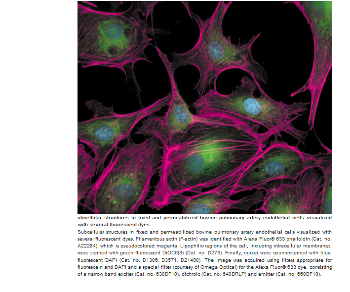DiOC6(3) is a cell-permeant, green-fluorescent, lipophilic dye that is selective for the mitochondria of live cells, when used at low concentrations. At higher concentrations, the dye may be used to stain other internal membranes, such as the endoplasmic reticulum.