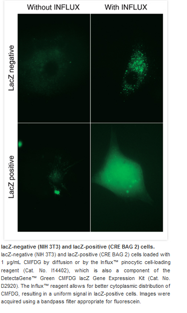 The DetectaGene™ Green lacZ Gene Expression Kit includes a fluorescein-based β-galactose derivative that has been chemically modified to include a mildly thiol-reactive chloromethyl group. Once inside a cell, the DetectaGene™ substrate undergoes two reactions: 1) its two galactose moieties are cleaved by intracellular β-galactosidase and 2) either simultaneously or sequentially, its chloromethyl moiety reacts with glutathione and possibly other intracellular thiols to form a membrane-impermeant, peptide-fluorescent dye adduct.