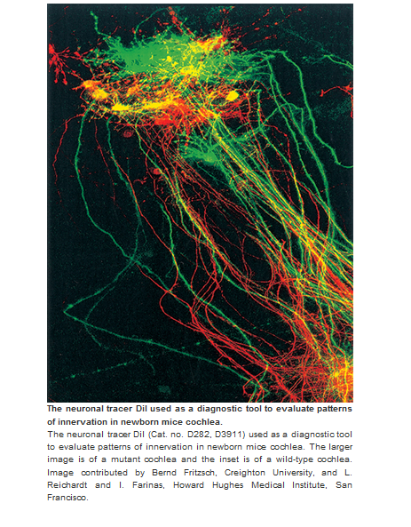 The far-red fluorescent, lipophilic carbocyanine DiD is a longer-wavelength DiI analog. It is an oil at room temperature and weakly fluorescent in water but highly fluorescent and quite photostable when incorporated into membranes. It has an extremely high extinction coefficient and short excited-state lifetimes (~1 nanosecond) in lipid environments. Once applied to cells, the dye diffuses laterally within the plasma membrane.