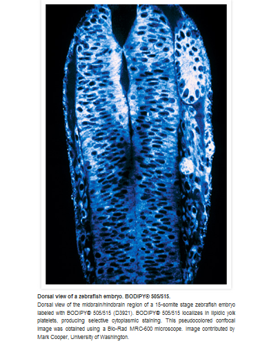 With its nonpolar structure and long-wavelength absorption and fluorescence, BODIPY® 505/515 can be used as a stain for netural lipds and as a tracer for oil and other nonpolar lipids.