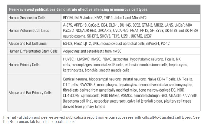目前我们已经对50多种细胞(参考下表)包括人类细胞,大鼠和小鼠细胞,甚至一些传统“难以转染”的细胞株进行验证,结果显示Accell siRNA都可以成功沉默目标基因表达。