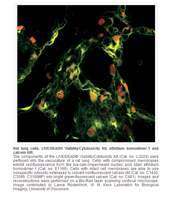 The cell-impermeant viability indicator ethdium homodimer-1 (EthD-1)is a high-affinity nucleic acid stain that is weakly fluorescent until bound to DNA and emits red fluorescence (excitation/emission maxima ~528/617).