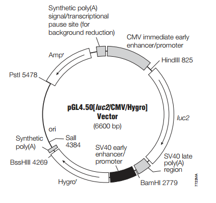The pGL4.50[luc2/CMV/Hygro] Vector encodes the luciferase reporter geneluc2(Photinus pyralis), which has been codon optimized for mammalian expression. This vector also is engineered with fewer consensus regulatory sequences for reduced backgrounds and a decreased risk of anomalous transcription. This vector contains the following features:luc2reporter gene for expression in mammalian cells; CMV promoter for high translational expression; SV40 late poly(A) signal sequence is positioned downstream ofluc2to provide efficient transcription termination and mRNA polyadenylation; Binding region for RV primer 3 and RV primer 4; Synthetic poly(A) signal/transcription start site; Synthetic Hygromycin B-resistance gene for mammalian cell selection of the plasmid; Plasmid replication origin; Amprgene for bacterial selection for vector amplification.