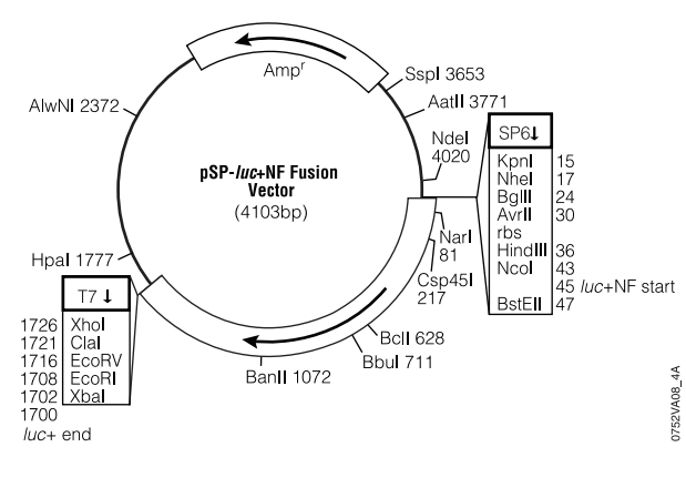 pSP-luc +NF Fusion Vector (pSP-luc +NF 融合载体) 是一种盒式萤光素酶载体,含有工程化的萤火虫萤光素酶基因luc +NF。luc +NF 基因与真核报告基因载体pGL3 家族中的luc + 基因相关,但已经在萤光素酶的N 端融合区(NF) 进行了进一步的改进以获得最大的灵活性。在表达载体中亚克隆luc +NF,提供了具有超常灵敏度的可遗传的报告基因。pSP-luc + NF 融合载体本身并不是用于在真核细胞中表达萤光素酶的,因为它不包含真核启动子、增强子或多聚腺苷酸信号。 紧邻萤光素酶ATG 翻译密码子的下游插入了一个独特的BstEII位点,这样可以将克隆的片段插入到紧邻luc +NF 起始密码子的下游。当融合蛋白中萤光素酶的N 端不带有ATG 密码子时,推荐使用该载体。 luc +NF 基因位于SP6 启动子和核糖体结合位点的下游,另有一个反向的T7 启动子位于luc +NF 基因的下游。这样,pSP-luc +NF 融合载体就成为一个方便的模板,用于体外合成萤光素酶转录本的正义链和反义链,进行原位杂交、RNA 加工、RNA 转染或偶联的转录/翻译以及蛋白折叠等方面的研究。 含常用限制性内切酶识别序列的多克隆区域位于luc +NF 的5` 末端及3` 末端,以提供最大限度的克隆灵活性。用萤光素酶检测系统可对萤光素酶活性进行最有效的检测。