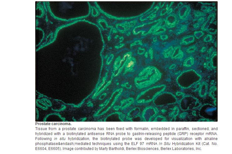 The ELF® 97 mRNA In Situ Hybridization Kit #1 provides a rapid and sensitive assay for detecting mRNA in situ hybridization signals in cells and tissue sections. The kit is designed to detect alkaline phosphatase conjugates that have been applied to detect DNA or RNA probes utilizing the ELF® 97 phosphatase substrate that upon hydrolysis produces a bright and photostable yellow-green fluorescent precipitate at the site of enzymatic activity. This fluorescent precipitate has several unique spectral characteristics, including an extremely large Stokes shift, 180 nm that makes it easily distinguishable from endogenous fluorescence.