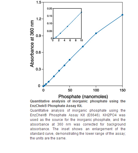 The EnzChek® Phosphate Assay Kit provides a fast and sensitive spectrophotometric method for the quantification of inorganic phosphate in solution and for phosphate released during ATPase or GTPase enzymatic reactions.