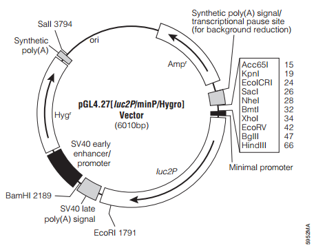 Creating a cell line with an indicator of a functional signaling pathway is useful for deciphering the components in a signaling pathway. These tools are made by insertion of multiple repeats of a response element upstream of a minimal promoter (minP). Promega has designed vectors that report the activity of a variety of pathways using the optimized luc2 firefly luciferase gene in the pGL4 backbone. These vectors also have a hygromycin resistance selectable marker, allowing use either in transient transfection experiments or for selection of a stable cell line.
