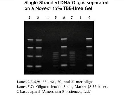 Denaturing polyacrylamide TBE-Urea Gels resolve single-stranded DNA oligos or RNA into sharp, distinct bands. Novex® TBE-Urea Gels are optimized for the analysis and purification of products ranging from 20-800 bases, making them an ideal choice for synthetic oligo analysis and purification, RNase Protection Assays (RPA), in vitro transcription studies, and Northern blot analysis. Novex® TBE-Urea Gels are designed to run on the XCell SureLock™ Mini-Cell.