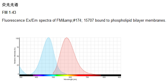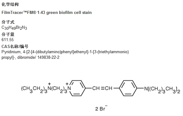 FM dyes are lipophilic styryl compounds used in a wide variety of studies involving plasma membrane and vesiculation. The water-soluble FM® dyes are virtually nonfluorescent in aqueous media and are believed to insert into the surface membrane where they become intensely fluorescent. FM® 1-43 stain has been used successfully to stain the cell bodies specifically in a complex biofilm mileu, including Pseudomonas aeruginosa, Escherichia coli, Staphylococcus sp., Acidothiobacillus caldus, and Vibrio cholerae.