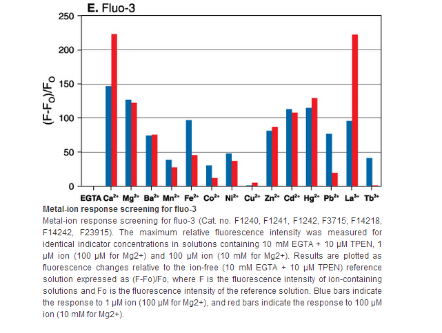 Labeled calcium indicators are molecules that exhibit an increase in fluorescence upon binding Ca2+. Fluo-3 has been used to image the spatial dynamics of Ca2+ signaling, in flow cytometry experiments involving photoactivation of caged chelators, second messengers, and neurotransmitters, and for cell-based pharmacological screening. Fluo-4 is an analog of fluo-3 with the two chlorine substituents replaced by fluorines, which results in increased fluorescence excitation at 488 nm and consequently higher fluorescence signal levels. Cells may be loaded with the AM ester forms of these calcium indicators by adding the dissolved indicator directly to dishes containing cultured cells. These indicators are useful for fluorescence and confocal microscopy, flow cytometry, and microplate screening applications.