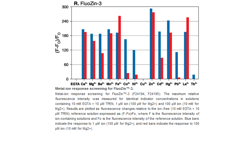 We offer a number of fluorescent indicators to determine polyvalent cation concentrations inside cells, to follow metal ion transport through ion channels, to make measurements in environmental samples, and more. Review Fluorescent Indicators for Zn2+ and Other Metal Ions—Section 19.7 in the Molecular Probes® Handbook for more information on these products.