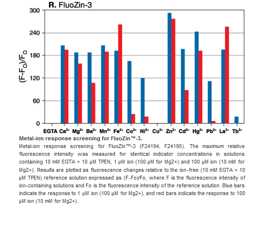 We offer a number of fluorescent indicators to determine polyvalent cation concentrations inside cells, to follow metal ion transport through ion channels, to make measurements in environmental samples, and more. Review Fluorescent Indicators for Zn2+ and Other Metal Ions—Section 19.7 in the Molecular Probes® Handbook for more information on these products.