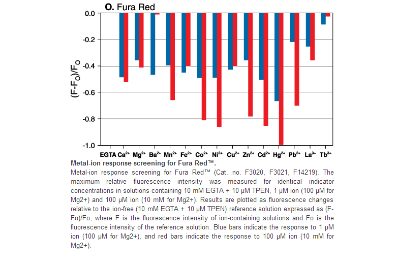 Fura Red, AM is a visible light—excitable fura-2 analog that offers unique possibilities for ratiometric measurement of Ca2+ in single cells by microphotometry, imaging or flow cytometry when used with single excitation, green-fluorescent calcium indicators. This acetoxymethyl (AM) ester form is useful for noninvasive intracellular loading and is also available in special packaging (F-3021).