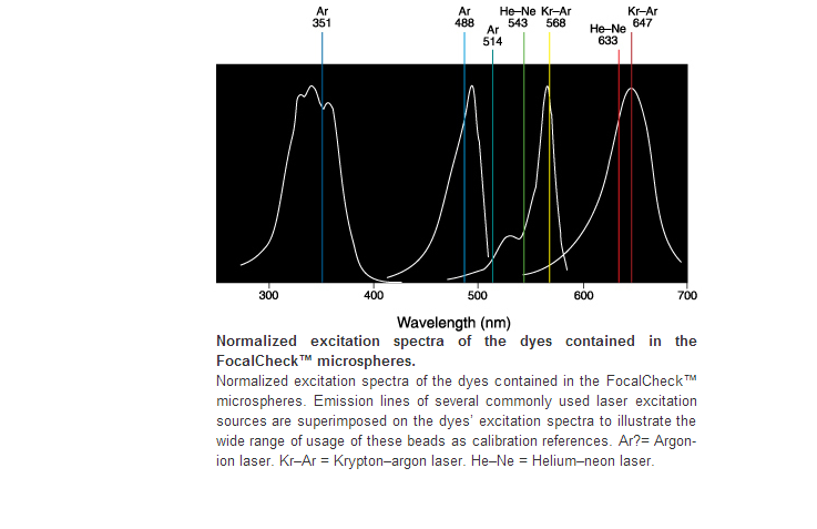 The FocalCheck™ fluorescence microscope test slide #2 is specifically designed for calibrating fluorescence microscope systems and evaluating system and filter performance. This slide provides a robust, reproducible method of evaluating the performance of spectral imaging systems, as well as the ability to discriminate closely overlapping spectra. The slide consists of 6 µm-diameter microspheres labeled with a series of spectrally overlapping dyes.