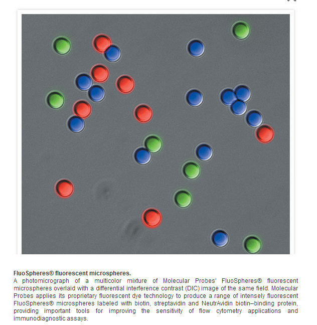 Microspheres (also called latex beads or latex particles) are spherical particles in the colloidal size range that are formed from an amorphous polymer such as polystyrene. Our Molecular Probes® FluoSpheres® beads are manufactured using high-quality, ultraclean polystyrene and are loaded with a variety of our proprietary dyes to create intensely fluorescent beads that typically show little or no photobleaching, even when excited with the intense illumination required for fluorescence microscopy. Different surface modifications are available to facilitate the coupling of various molecules and proteins to the surface of the bead.