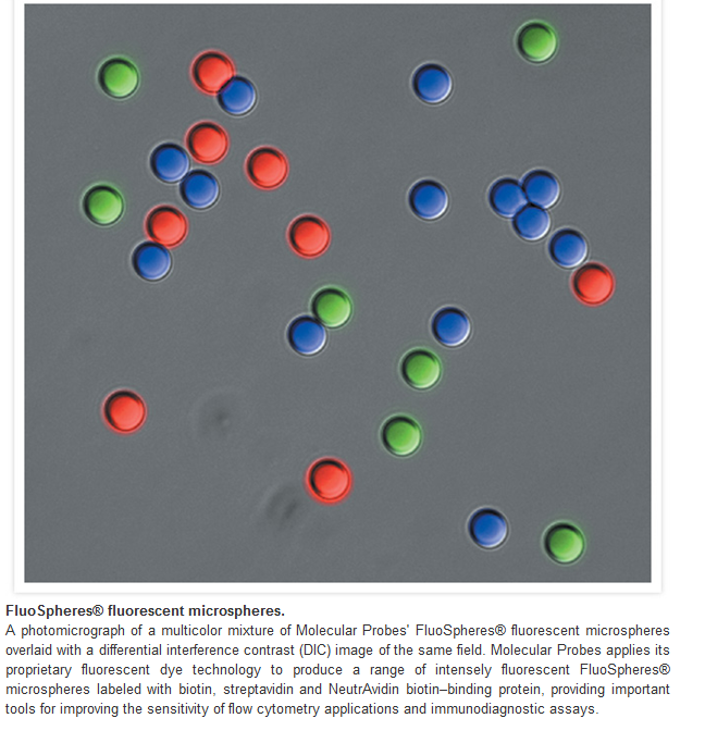 Microspheres (also called latex beads or latex particles) are spherical particles in the colloidal size range that are formed from an amorphous polymer such as polystyrene. Our Molecular Probes® FluoSpheres® beads are manufactured using high-quality, ultraclean polystyrene and are loaded with a variety of our proprietary dyes to create intensely fluorescent beads that typically show little or no photobleaching, even when excited with the intense illumination required for fluorescence microscopy. Different surface modifications are available to facilitate the coupling of various molecules and proteins to the surface of the bead.