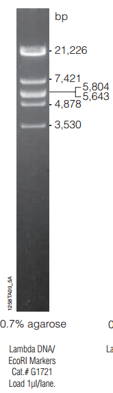 λ DNA/EcoRI Markers: Six ethanol-precipitated DNA fragments ranging in size from 3,530bp to 21,226bp.