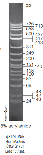 ΦX174 DNA/HinfI Markers: Twenty ethanol-precipitated DNA fragments ranging in size from 24bp to 726bp.