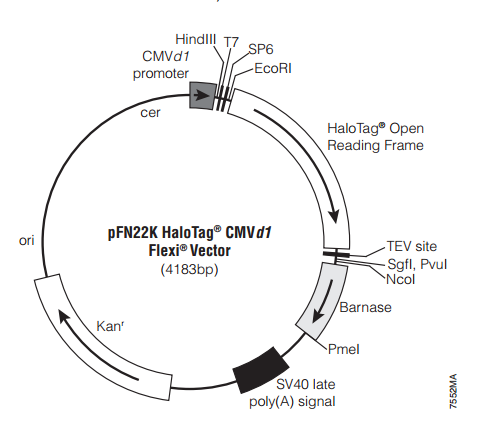 These vectors are designed for expression of N-terminal-tagged HaloTag® fusion proteins in mammalian cells. Once expressed, the HaloTag® fusion protein may be used for cell imaging of protein localization or trafficking in conjunction with thefluorescent HaloTag® Ligands. In addition, the HaloTag® fusion protein can be purified or pulled down as a complex with its protein partners.