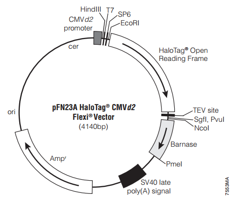 These vectors are designed for expression of N-terminal-tagged HaloTag® fusion proteins in mammalian cells. Once expressed, the HaloTag® fusion protein may be used for cell imaging of protein localization or trafficking in conjunction with thefluorescent HaloTag® Ligands. In addition, the HaloTag® fusion protein can be purified or pulled down as a complex with its protein partners.