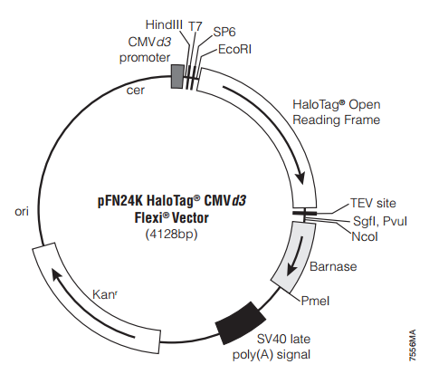 These vectors are designed for expression of N-terminal-tagged HaloTag® fusion proteins in mammalian cells. Once expressed, the HaloTag® fusion protein may be used for cell imaging of protein localization or trafficking in conjunction with thefluorescent HaloTag® Ligands. In addition, the HaloTag® fusion protein can be purified or pulled down as a complex with its protein partners.