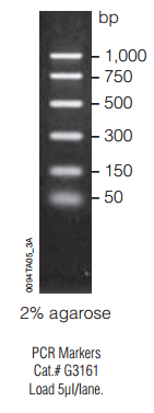 PCR Markers: Six bands of equal intensity of 50, 150, 300, 500, 750 and 1,000bp. The PCR Markers may be run on polyacrylamide gels with less loading volume; however, additional bands may be visible compared to those visible on agarose gels.