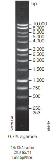 1kb DNA Ladder: Thirteen blunt-ended fragments with sizes ranging from 250bp to 10,000bp. The 1,000bp and 3,000bp fragments have increased intensity relative to the other bands on ethidium bromide-stained agarose gels for easy identification. All other fragments are of equal intensity. The ladder is dephosphorylated and ready for 5´ end-labeling with radioisotopes using T4 Polynucleotide Kinase, allowing visualization by autoradiography.