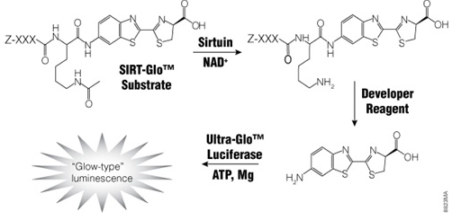 The SIRT-Glo™ Assays and Screening Systems are single-reagent-addition, homogeneous, luminescent assays that measure the relative activity of the NAD+-dependent histone deacetylase (HDAC) class III enzymes (sirtuins; SIRTs) from purified enzyme sources. The assays use an acetylated, luminogenic peptide substrate that can be deacetylated by SIRT activities. Deacetylation of the peptide aminoluciferin substrate is measured using a coupled enzymatic system in which a protease in the Developer Reagent cleaves the deacetylated peptide from the aminoluciferin substrate, releasing aminoluciferin, which is quantified in a reaction using Ultra-Glo™ recombinant firefly luciferase. The assay reaction is typically complete within 15–45 minutes with no sample manipulation. The SIRT-mediated luminescent signal is persistent with a half-life of greater than 3 hours, allowing batch processing of multiwell plates. The SIRT-Glo™ Assay is broadly useful for NAD+-dependent Sirtuin enzymes.