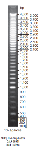 100bp DNA Step Ladder: Forty blunt-ended DNA fragments ranging from 100bp to 4,000bp in 100bp increments. Two internal features facilitate band identification. A high-intensity 500bp band stands out at the lowest segment of the ladder (<1kb). Bands within each segment (<1kb, <2kb, <4kb) have approximately the same intensity.
