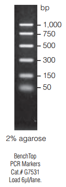 BenchTop PCR Markers: Six bands of equal intensity of 50, 150, 300, 500, 750, and 1,000bp. The BenchTop PCR Markers may be run on polyacrylamide gels with less loading volume; however, additional bands may be visible compared to those visible on agarose gels.