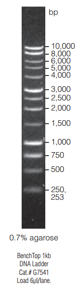 BenchTop 1kb DNA Ladder: Thirteen blunt-ended fragments with sizes ranging from 250bp to 10,000bp. The 1,000bp and 3,000bp fragments have increased intensity relative to the other bands on ethidium bromide-stained agarose gels for easy identification. All other fragments are of equal intensity. The ladder is dephosphorylated and ready for 5´ end-labeling with radioisotopes using T4 Polynucleotide Kinase, allowing visualization by autoradiography.