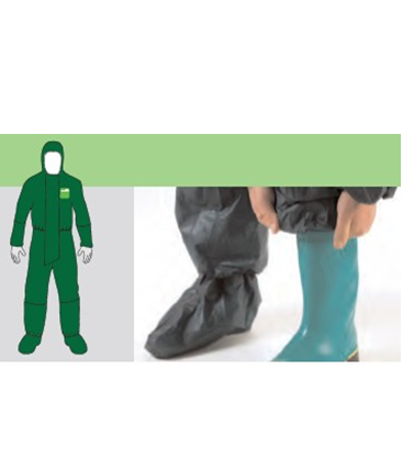 2片式帽子,前襟双拉链,双袖、内袖口罗纹,帽子、外袖口、腰部及脚口松紧,连体袜子及外裤腿;适合需要防护高浓度化学品和生物介质的有害区域。