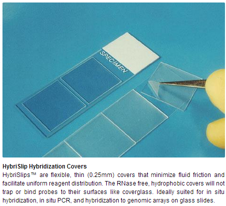 HybriSlip hybridization covers are nuclease free, ready to use and designed specifically for in situ hybridization. These hydrophobic coverslips do not require lengthy preparation or blocking procedures to prevent probe trapping or binding. HybriSlip covers are heat resistant and do not curl, even at high temperatures. They are ideal for denaturation steps or in situ PCR incubations.[The PCR process is covered by patents owned by Hoffmann-LaRoche, Inc. Purchase of these products does not convey a license under these patents.]