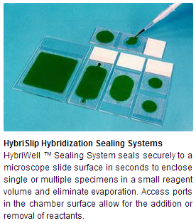 The HybriWell hybridization sealing system is a coverslip—seal combination that forms chambers optimized for in situ hybridization work. Each disposable incubation chamber seals securely to a microscope slide, providing a limited-volume chamber for reagent addition. Solutions are easily added through dual-access ports without disrupting the specimen. The hydrophobic coverslips are nuclease free and will not trap or bind probes, allowing uniform distribution of the reagent over the specimen. The HybriWell sealing system also includes a quick-seal tool to secure the hydrophobic cover to the microscope slide, as well as nuclease-free adhesive seal tabs to cover the access ports (seal tabs are also available separately).