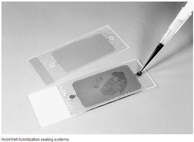 The HybriWell™ hybridization sealing systems are coverslip-seal combinations that attach to microscope slides to form microwells optimized for carrying out in situ hybridization procedures. These ready-to-use hybridization gaskets have a special adhesive that bonds to glass slides in seconds, creating a water-tight seal that is temperature resistant but can also be removed cleanly and easily after hybridization. Solutions are easily added or removed through dual-access ports without disrupting the specimen. The hydrophobic coverslips are nuclease free and will not trap or bind probes, allowing uniform distribution of the reagent over the specimen.