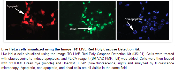 The Image-iT™ LIVE Red Poly Caspases Detection Kit employs a novel approach to detect active caspases that is based on a fluorescent inhibitor of caspases (FLICA™) methodology, essentially an affinity label. The reagent associates a fluoromethyl ketone (FMK) moiety, which can react covalently with a cysteine, with a caspase-specific amine acid sequence. For poly caspases, this recognition sequence is valine-alanine-aspartic acid (VAD). A sulforhodamine group (SR) is attached as a reporter. The FLICA reagent is thought to interact with the enzymatic reactive center of an activated caspase via the recognition sequence, and then to attach covalently through the FMK moiety. The FLICA inhibitor is cell permeant and noncytotoxic. Unbound FLICA molecules diffuse out of the cell and are washed away; the remaining red-fluorescent signal is a direct measure of the amount of active caspase that was present at the time the inhibitor was added.