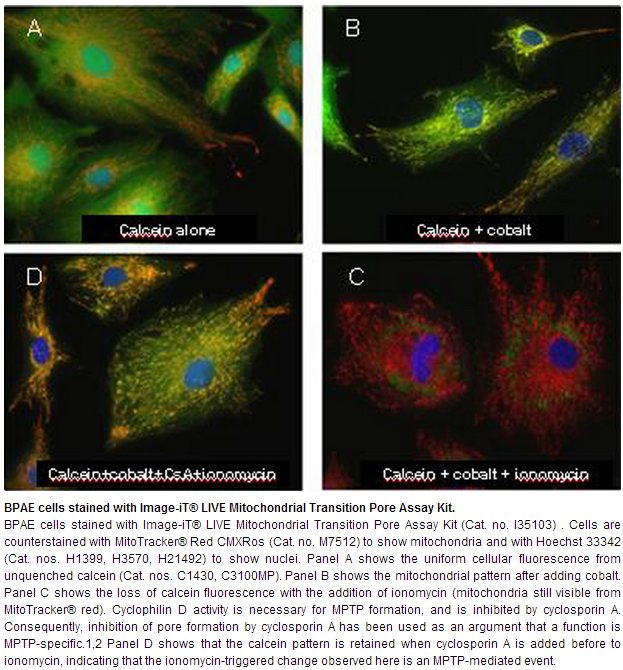 The Image-iT® LIVE Mitochondrial Transition Pore Assay Kit provides a proven method[REF PN36389 ,PN32679] of measuring mitochondrial permeability transition pore opening. The kit includes a dye and a quencher that are easily loaded into cells. In healthy cells, the dye, but not the quencher, enters mitochondria. The mitochondria remain brightly fluorescent until mitochondrial pore activation permits quenching of the fluorescence.