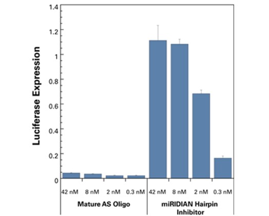 Figure1. miRNA inhibitor function for miR-22 was assayed in HeLa cells 48 h after transfection of mature antisense or miRIDIAN microRNA Inhibitor (0.06 - 50 nM) using a dual luciferase reporter system. Control samples received no inhibitors.