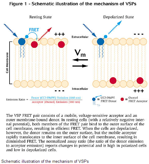 Voltage Sensor Probes (VSPs) are a Fluorescence Resonance Energy Transfer (FRET)-based voltage-sensing assay technology used to measure changes in cellular membrane electrical potential. VSPs are ideal for screening compounds that modulate ion channels because they provide: