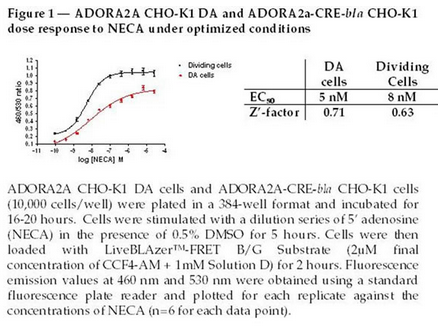 DA cells are irreversibly division arrested using a low-dose treatment of Mitomycin-C, and have no apparent toxicity or change in cellular signal transduction. Both ADORA2A CHO-K1 DA cells and ADORA2A-CRE-blaCHO-K1 cells are functionally validated for Z’-factor and EC50concentrations of 5’-adenosine (NECA); (Figure 1). In addition, ADORA2A-CRE-bla CHO-K1 cells have been tested for assay performance under variable conditions, including DMSO concentration, cell number, stimulation time, and substrate loading time (data available upon request). Additional testing data using alternate stimuli are also available.
