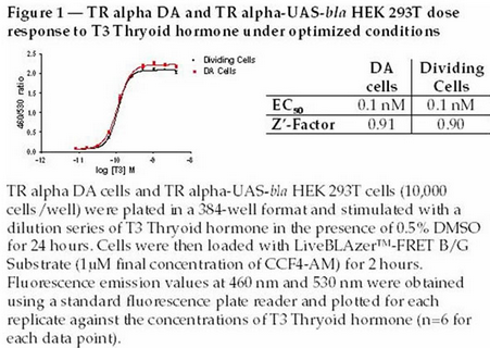 GeneBLAzer®TR alpha DA(Division Arrested) cells and TR alpha-UAS-bla HEK 293T cells contain the ligand-binding domain (LBD) of the human Thyroid hormone receptor alpha(TR alpha) fused to the DNA-binding domain of GAL4 stably integrated in the GeneBLAzer®UAS-bla HEK 293T cell line. GeneBLAzer®UAS-bla HEK 293T cells stably express a beta-lactamase reporter gene under the transcriptional control of an upstream activator sequence (UAS). When an agonist binds to the LBD of the GAL4 (DBD)-TR alpha (LBD) fusion protein, the protein binds to the UAS, resulting in expression of beta-lactamase. Division Arrested (DA) cells are available in two configurations- an Assay Kit (which includes cells and sufficient substrate to analyze 1 x 384-well plate), and a tube of cells sufficient to analyze 10 x 384-well plates. DA cells are irreversibly division arrested using a low-dose treatment of Mitomycin-C, and have no apparent toxicity or change in cellular signal transduction. Both TR alpha DA cells and TR alpha-UASbla HEK 293T 293 cells are functionally validated for Z' and EC50 concentrations of T3 Thryoid hormone. In addition, TR alpha-UAS-bla HEK 293T 293 cells have been tested for assay performance under variable conditions, including DMSO concentration, cell number, stimulation time, and substrate loading time (data available upon request). Additional testing data using alternate stimuli are also available.